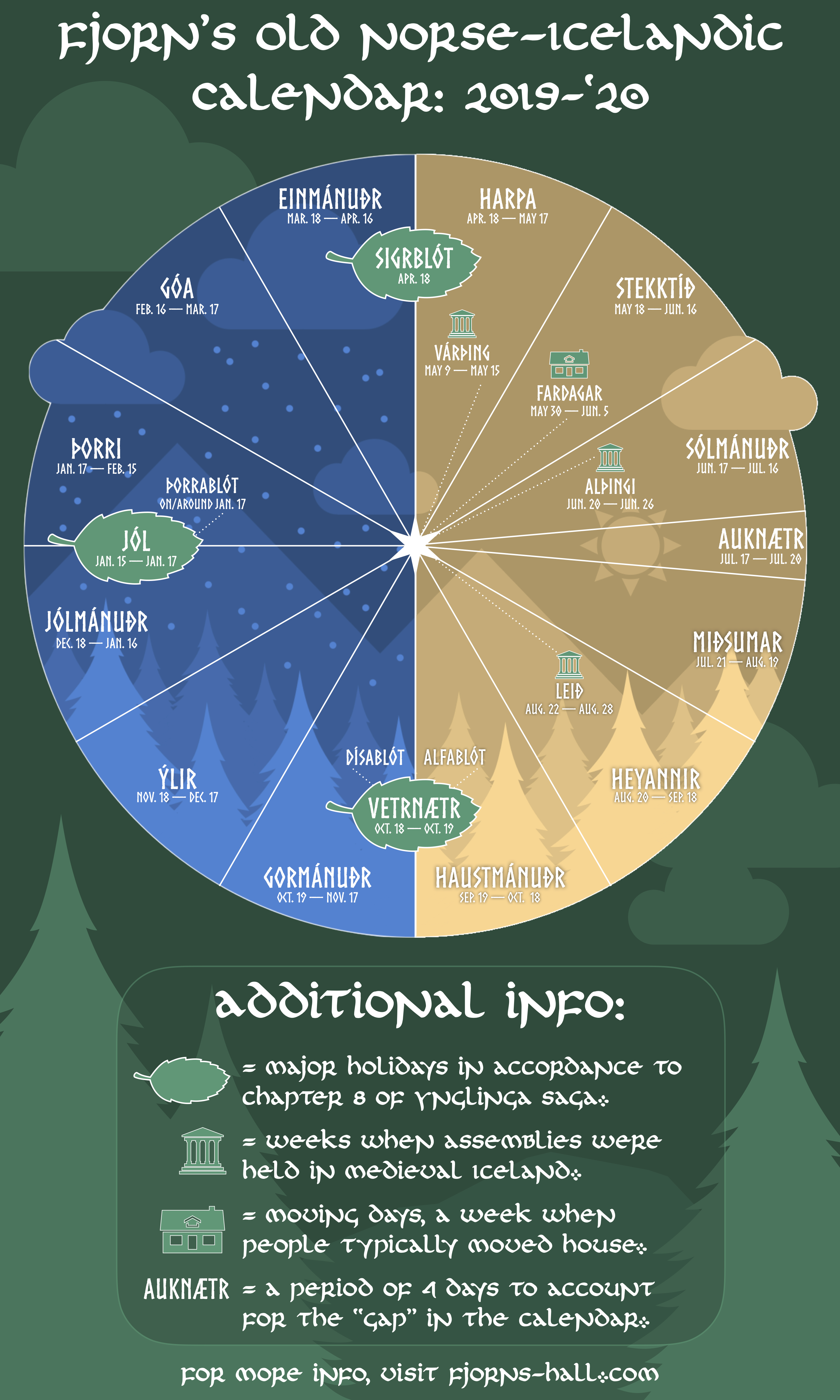 Want a cool graphic to help you navigate this year like a Viking? Want one that’s historically informed to the best of this author‘s abilities? Well, for starters then, that was a poor use of the term ‘Viking,’ as most of my guests and readers will know by now. And if that sentence stumps you, I recommend skimming through this post to get on board with the rest of us. Likewise, you may want to read this post about how the Old Norse-Icelandic calendar works. It includes more information than my single graphic could possibly hold, such as how medieval Icelanders conceptualized time at every level (hours, days, weeks, months, etc.). Reading that post will make the following web-loot more understandable.